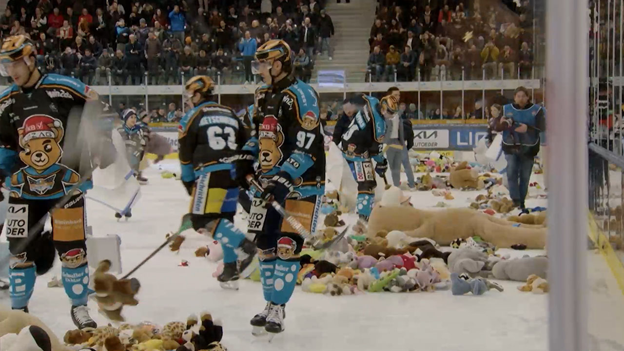 Beim Eishockey gibt’s eine besondere Tradition. Den sogenannten Teddy Bear Toss. Was hat es mit den fliegenden Plüschtieren auf sich?