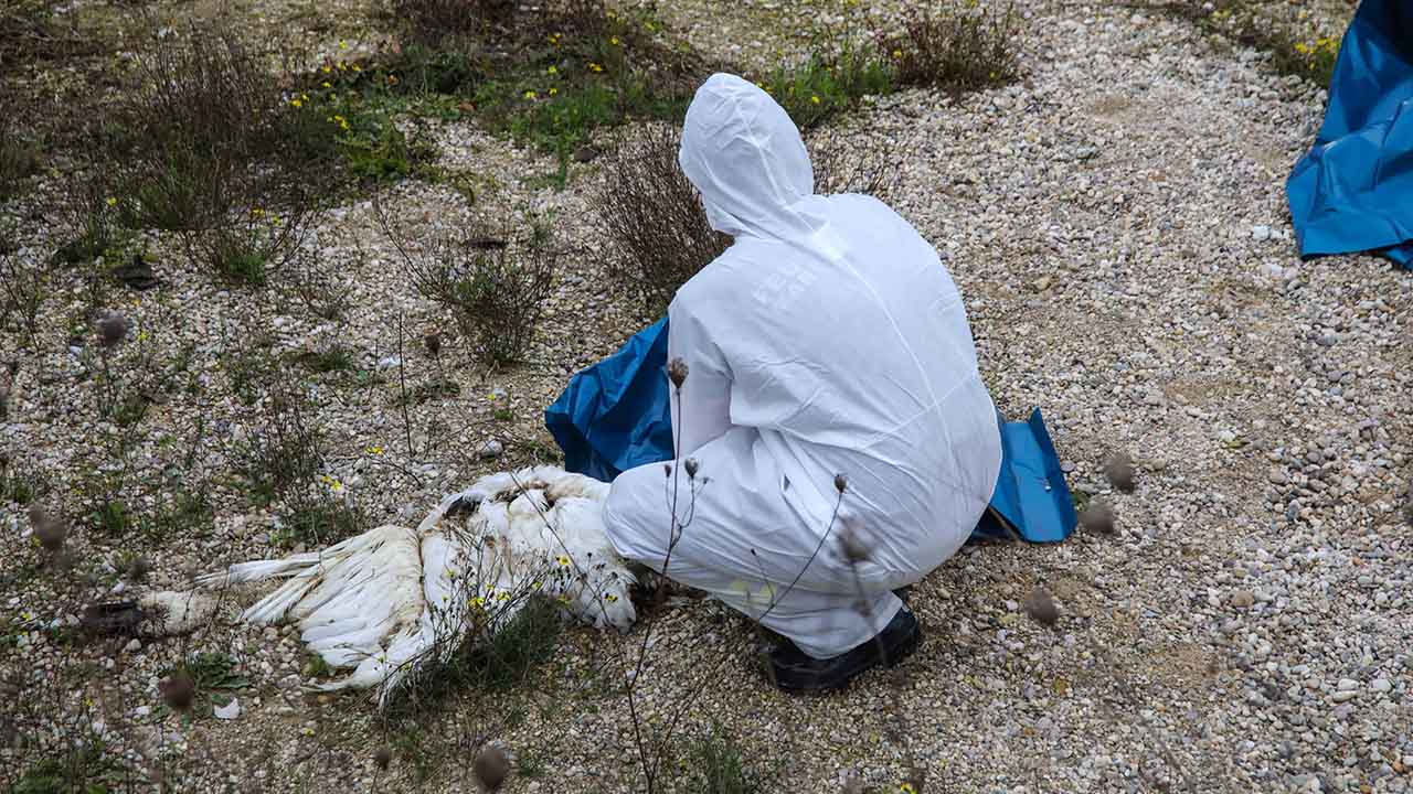 Tote Schwäne in Marchtrenk. Es besteht der Verdacht auf Vogelgrippe. Im Bezirk Wels Land bergen deshalb Einsatzkräfte im Auftrag der Behörde die verendeten Tiere.