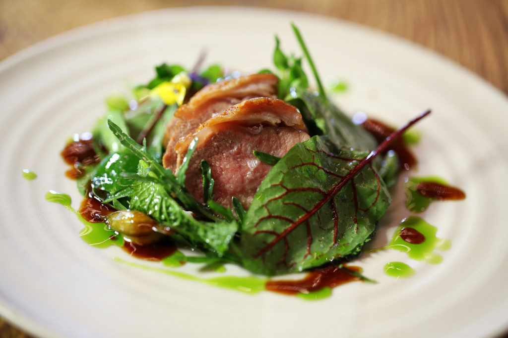 Das Fleisch mittig am Teller anrichten. Mit grobem Salz würzen.