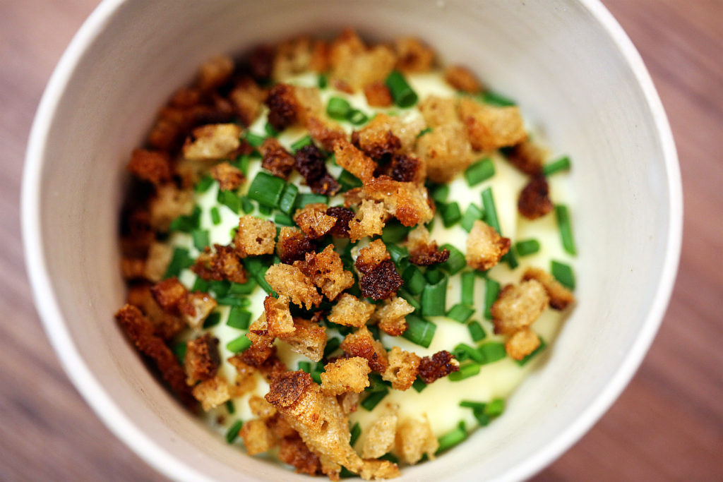 Das Tatar mit Hilfe eines Rings rund anrichten. In die Mitte eine kleine Mulde drücken, das Eigelb darin platzieren und mit grobem Salz würzen. Das Ganze mit dem Espuma abdecken und mit Schnittlauch und Croutons bestreuen.