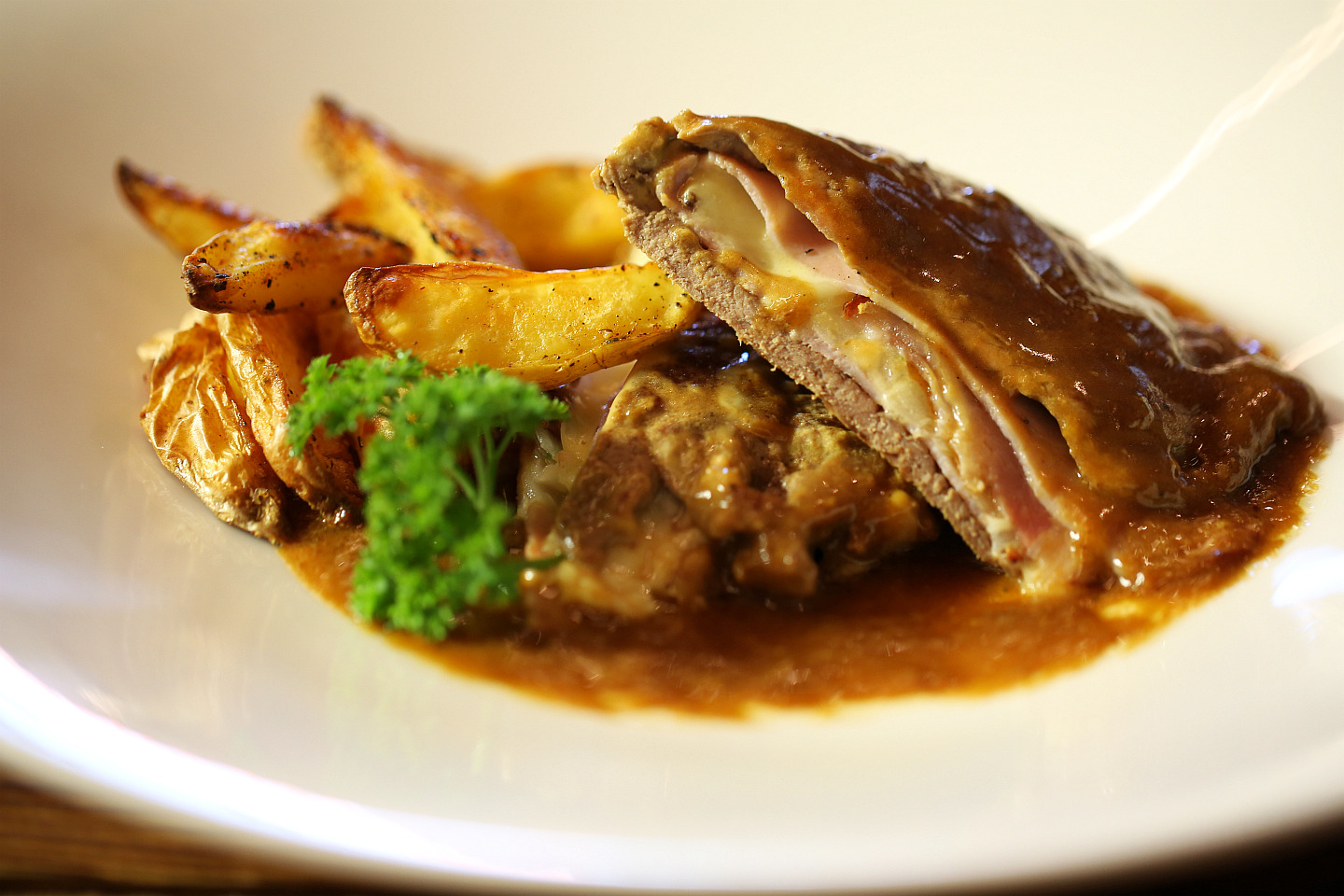 Die gefüllte Beiriedschnitte in eine heiße Pfanne geben und auf jeder Seite 2 Minuten anbraten. So schmilzt der Käse und das Fleisch bleibt zart.
